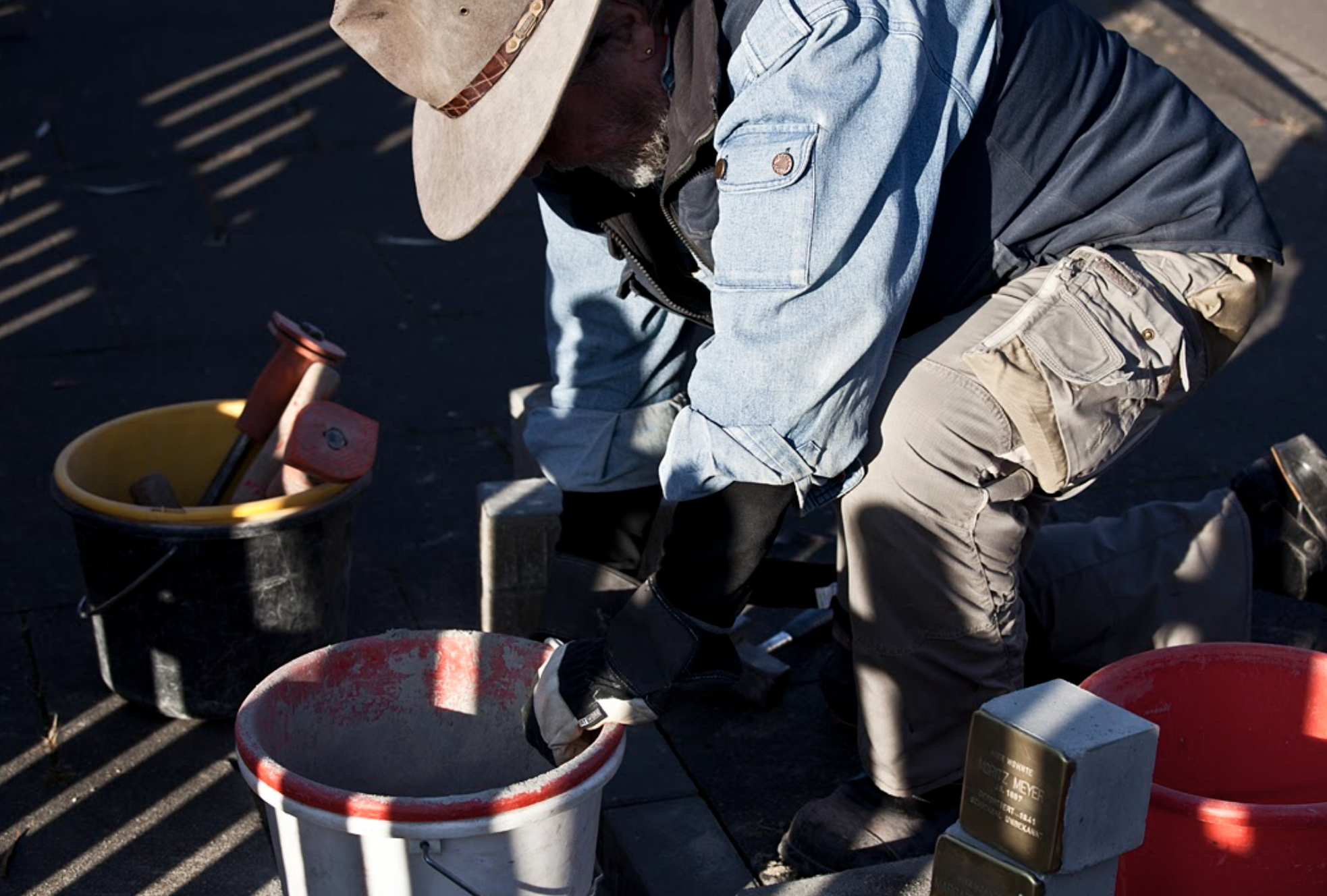 Gedenktafeln aus Messing in den Bürgersteig einlässt.